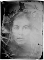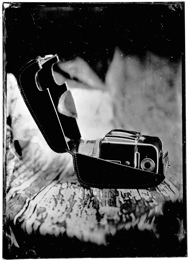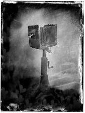 im nassen Zustand (wet-plate) in eine antike Balgenkamera eingeführt und