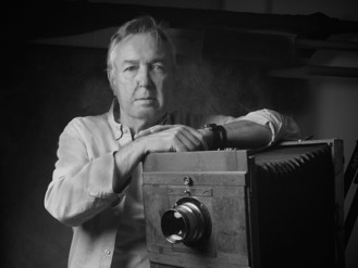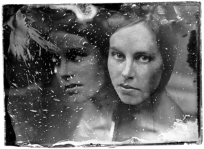 im nassen Zustand (wet-plate) in eine antike Balgenkamera eingeführt und